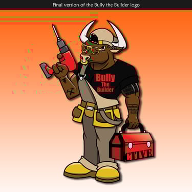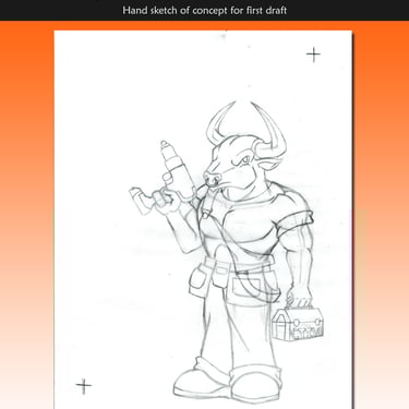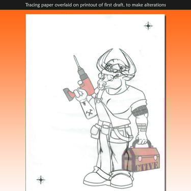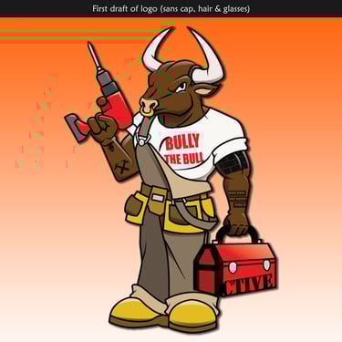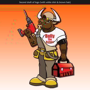 My client for this does carpentry for a living. He wanted to have his own carpentry business. He wanted not just a logo, but a mascot. He chose a bull for this. I had to practice drawing the features of a bull. He wanted me to incorporate tattoos, related to carpentry and building. This logo was to be a mascot version of himself, which was the reasoning for the tattoos-- he had tattoos as well.